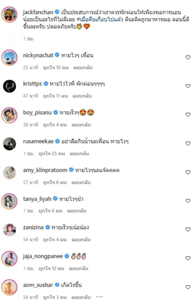 ล่าสุด นักเเสดงชื่อดังอย่าง เเจ๊ค เฉลิมพล ทิฆัมพรธีรวงศ์ หรือ เเจ๊ค เเฟนฉัน เจ้าตัวได้โพสต์ภาพของตัวเองนอนอยู่ที่โรงพยาบาล พร้อมเเคปชั่นว่า “เป็นประสบการณ์ว่าเราควรพักผ่อนให้เพียงพอการนอนน้อยเป็นอะไรที่ไม่ดีเลย #เมื่อคืนเกือบไปแล้ว ดีนะคิดถูกมาหาหมอ ตอนนี้ดีขึ้นละครับ ปลอดภัยครับ” ทำเอาบรรดาเเฟนคลับตกอกตกใจ