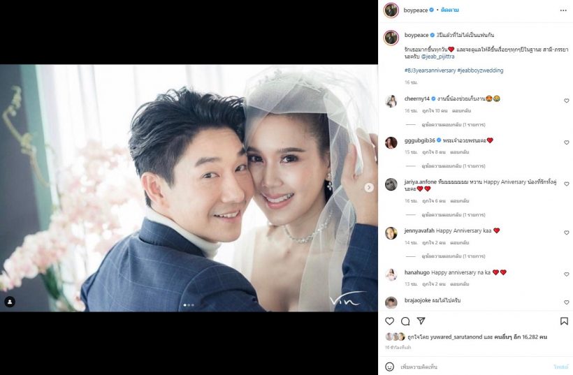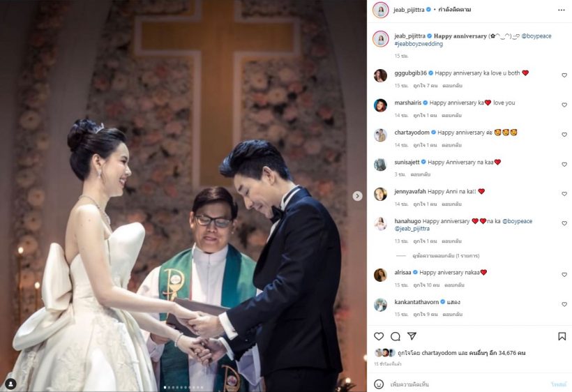 “3ปีแล้วที่ไม่ได้เป็นแฟนกัน รักเธอมากขึ้นทุกวัน และจะดูแลให้ดีขึ้นเรื่อยๆทุก ๆ ปีในฐานะ สามี-ภรรยานะครับ #BJ3yearsanniversary”ฝั่งของ เจี๊ยบ พิจิตตรา ก็ได้โพสต์โมเมนต์ในงานแต่งเช่นกันพร้อมข้อความ “Happy anniversary”