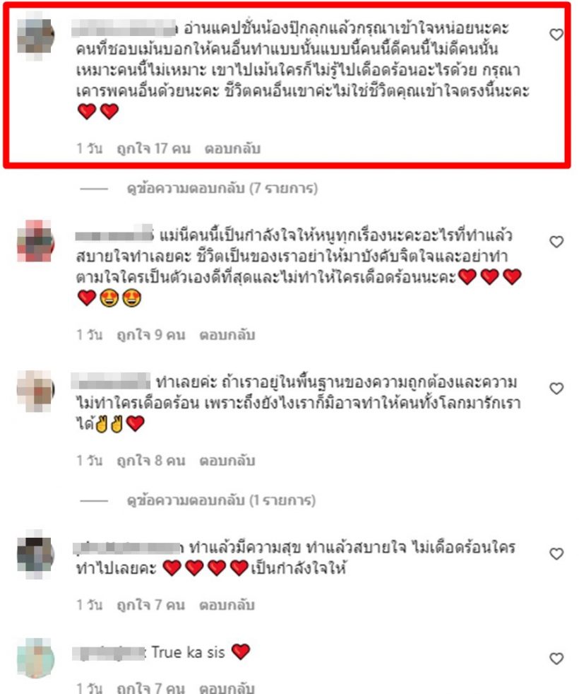 “เรากำหนดชีวิตเรา ไม่ใช่ใครมาบอกว่าเรา ควร หรือ ไม่ควร ใช่ หรือ ไม่ใช่ .. อะไรที่เราอยากทำ ทำแล้วไม่ทำร้ายใคร ไม่มีใครได้รับผลกระทบที่ไม่ดีจากเรา”