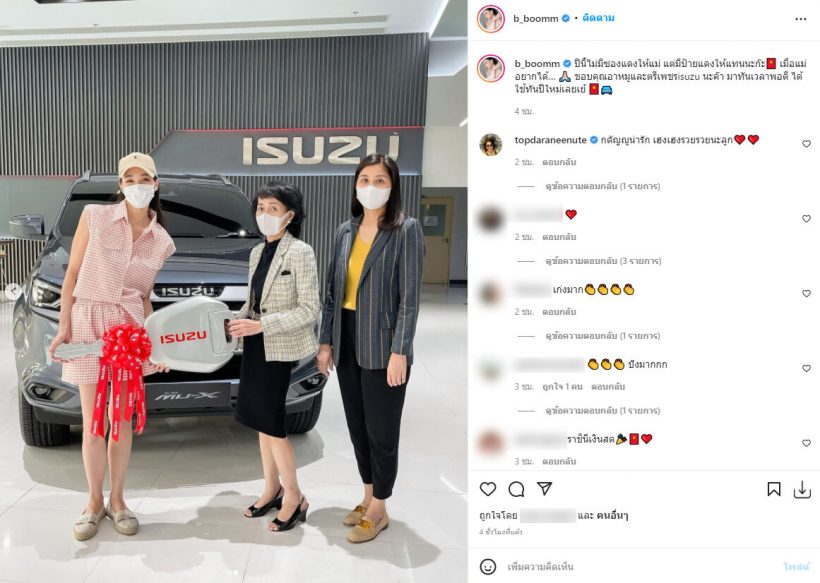 ‘บูม สุภาพร’ ได้ออกรถป้ายแดงคันใหม่ให้กับ คุณแม่ เป็นลูกที่น่ารักสุด ๆ ได้โพสต์รูปพร้อมแคปชั่นว่า ปีนี้ไม่มีซองแดง แต่มีป้ายแดงให้แทนนะก๊ะ