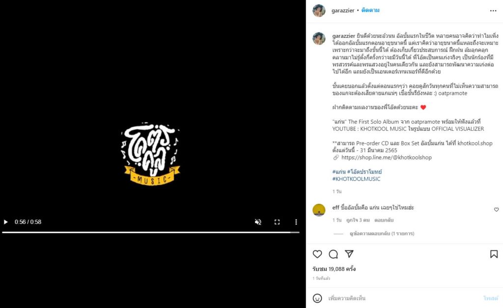 ล่าสุด สาวกิ้น โพสต์ร่วมยินดี ผลงานอัลบั้มแรกในชีวิตของ หนุ่มโอ๊ต “ยินดีด้วยนะอ้วนน อัลบั้มแรกในชีวิต หลายคนอาจคิดว่าทำไมเพิ่งได้ออกอัลบั้มแรกตอนอายุขนาดนี้ แต่เราคิดว่าอายุขนาดนี้แหละถึงจะเหมาะ เพราะกว่าจะมาถึงขั้นนี้ได้ ต้องเก็บเกี่ยวประสบการณ์ ฝึกฝน ล้มลุกคลุกคลานมาไม่รู้ตั้งกี่ครั้งกว่าจะมีวันนี้ได้ พี่โอ๊ตเป็นคนเก่งจริง ๆ เป็นนักร้องที่มีพรสวรรค์และพรแสวงอยู่ในคนเดียวกัน และยังสามารถพัฒนาความเก่งต่อไปได้อีก แถมยังเป็นเอนเตอร์เทนเนอร์ที่ดีอีกด้วย