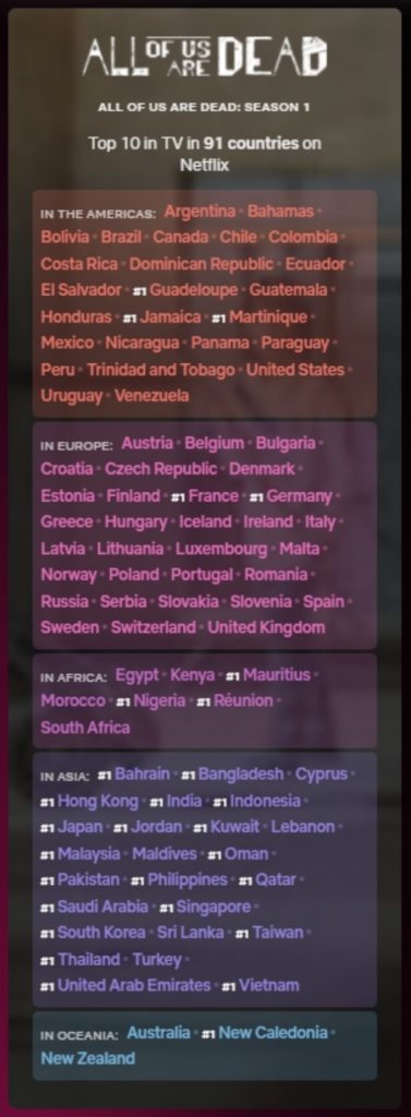 หลังจากที่ซีรีส์ มัธยมซอมบี้ (All of Us Are Dead) ออกฉายทาง Netflix บริการสตรีมมิ่งความบันเทิงระดับโลก ไปสด ๆ ร้อน ๆ ซีรีส์เรื่องนี้ก็พุ่งแรงติดอันดับ Netflix Top 10 (หมวดรายการทีวีภาษาต่างประเทศ) ใน 91 ประเทศทั่วโลก ถือเป็นข้อพิสูจน์ถึงพลังและความนิยมของคอนเทนต์เกาหลีในระดับโลกอีกครั้ง