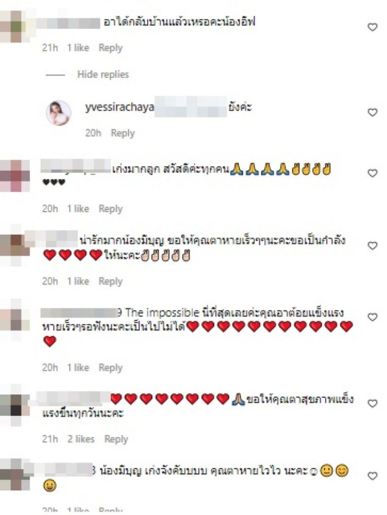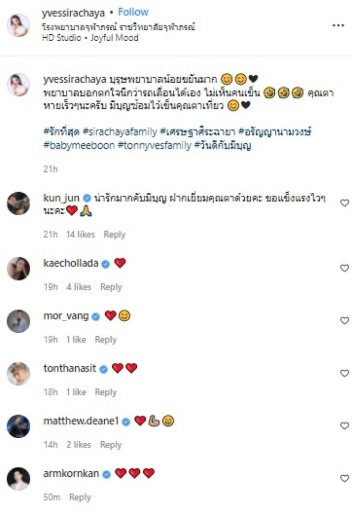 ล่าสุด ลูกสาว “อีฟ พุทธธิดา” โพสต์คลิป น้องมีบุญ โมเมนต์น่ารัก ๆ รับหน้าที่เป็นบุรุษพยาบาลตัวน้อย เข็นรถเข็นให้คุณตาตลอดทาง ทางด้านอีฟได้ตั้งแคปชั่นว่า “บุรุษพยาบาลน้อยขยันมาก พยาบาลบอกตกใจนึกว่ารถเลื่อนได้เอง ไม่เห็นคนเข็น คุณตาหายเร็ว ๆ นะครับ มีบุญซ้อมไว้เข็นคุณตาเที่ยว #รักที่สุด #sirachayafamily #เศรษฐาศิระฉายา #อรัญญานามวงษ์ #babymeeboon #tonnyvesfamily #วันดีกับมีบุญ”