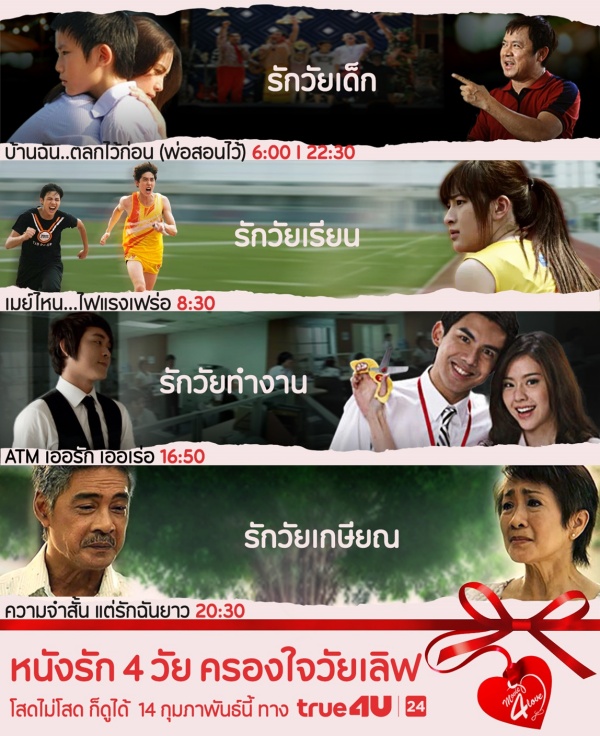 ต้อนรับเทศกาลแห่งความรัก ทรูโฟร์ยู ช่อง 24 ชวนผู้ชมทางบ้านมาอินเลิฟไปกับโปรแกรมหนังรอบพิเศษ “Movie for Love หนังรัก 4 วัย” ที่จะมาทำให้หน้าจอของคุณกลายเป็นสีชมพูตลอดวันวาเลนไทน์ กับหนังรักสุดโรแมนติกยอดฮิตที่คุณชื่นชอบ ไม่ว่าจะเป็นหนังรักคอมเมดี้ หนังรักสุดซึ้ง ไว้ดูคนเดียวก็ฟิน ดูกับแฟนก็เพิ่มความหวานจนมดขึ้นจอ