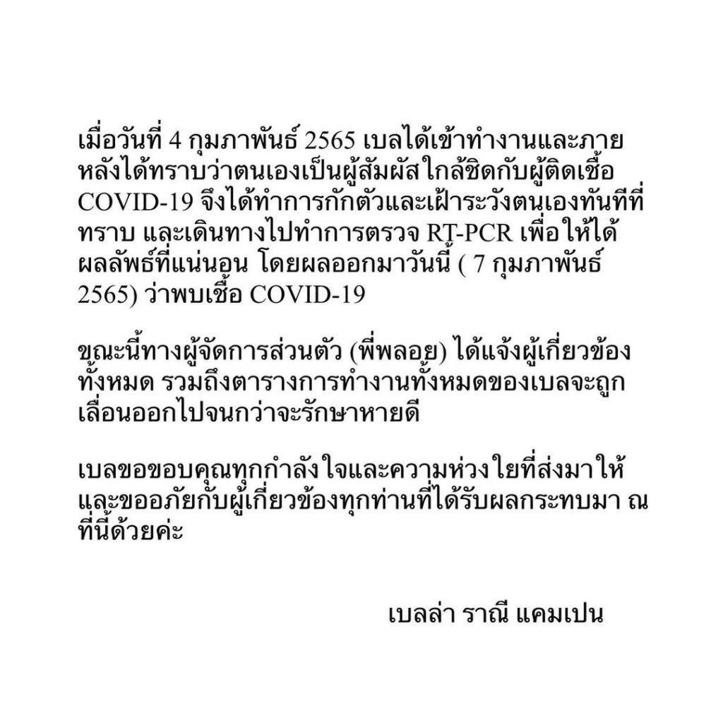 ” เมื่อวันที่ 4 กุมภาพันธ์ 2565 เบลได้เข้าทำงานและภายหลังได้ทราบว่าตนเองเป็นผู้สัมผัสใกล้ชิดกับผู้ติดเชื้อ COVID-19 จึงได้ทำการกักตัวและเฝ้าระวังตนเองทันทีที่ทราบ และเดินทางไปทำการตรวจ RT-PCR เพื่อให้ได้ผลลัพธ์ที่แนนอน โดยผลออกมาวันที่ ( 7 กุมภาพันธ์ 2565 ) ว่าพบเชื้อ COVID-19 ขณะนี้ทางผู้จัดการส่วนตัว (พี่พลอย) ได้แจ้งผู้ที่เกี่ยวข้องทั้งหมด รวมถึงตารางการทำงานทั้งหมดของเบลจะถูกเลื่อนออกไปจนกว่าจะรักษาหายดี เบลขอขอบคุณทุกกำลังใจและความห่วงใยที่ส่งมาให้และขออภัยกับผู้ที่เกี่ยวข้องทุกท่านที่ได้รับผลกระทบมา ณ ที่นี้ด้วยค่ะ. เบลล่า ราณี แคมเปน”