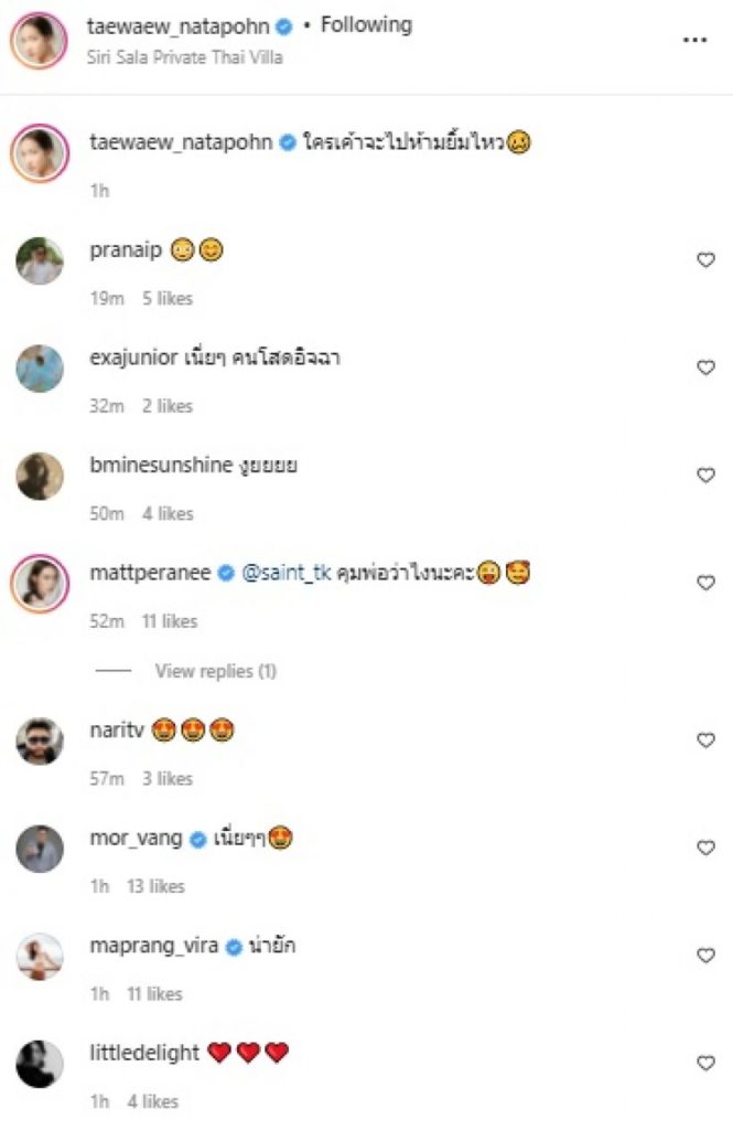 ล่าสุด สาวแต้ว ได้โพสต์ภาพช็อตหวานให้ได้ชมกันอีกครั้งผ่านอินสตราแกรม @taewaew_natapohn เป็นช็อตนั่งคู่กับไฮโซณัย มุ้งมิ้งกันที่บ่อปลา พร้อมแคปชั่นว่า “ใครเค้าจะไปห้ามยิ้มไหว” โดยไฮโซณัยก็ได้เข้ามาคอมเมนต์ อิโมจิยิ้ม😊