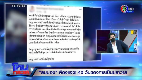 หลายคนอาจถามว่าทำไมต้องไล่บี้ทิดแบบนี้ วันนี้จำเป็นต้องถามให้หายสงสัย หนึ่งทิดสมปอง ยังทำงานกับผม อะไรก็ตามที่ผมพูดได้ หรือเตือนได้ ผมก็จะบอก ก่อนเข้ารายการ ตอนผมติดต่อไป อยากให้เขามาชี้แจงว่าเกิดอะไรขึ้น เขาก็บอกว่าไม่อยากมา ไม่รู้จะทำยังไงเหมือนกัน แต่สุดท้ายบอกว่าเขาจะมา แต่อย่าหาว่าผมสอนทิด ผมบอกเขาว่าสิ่งหนึ่งที่ต้องเอาไปคิดให้แตกก่อนออกรายการ คำว่าสง่าผ่าเผยคืออะไร?
