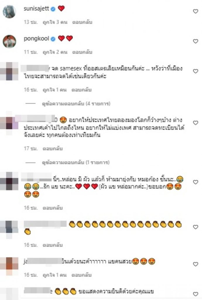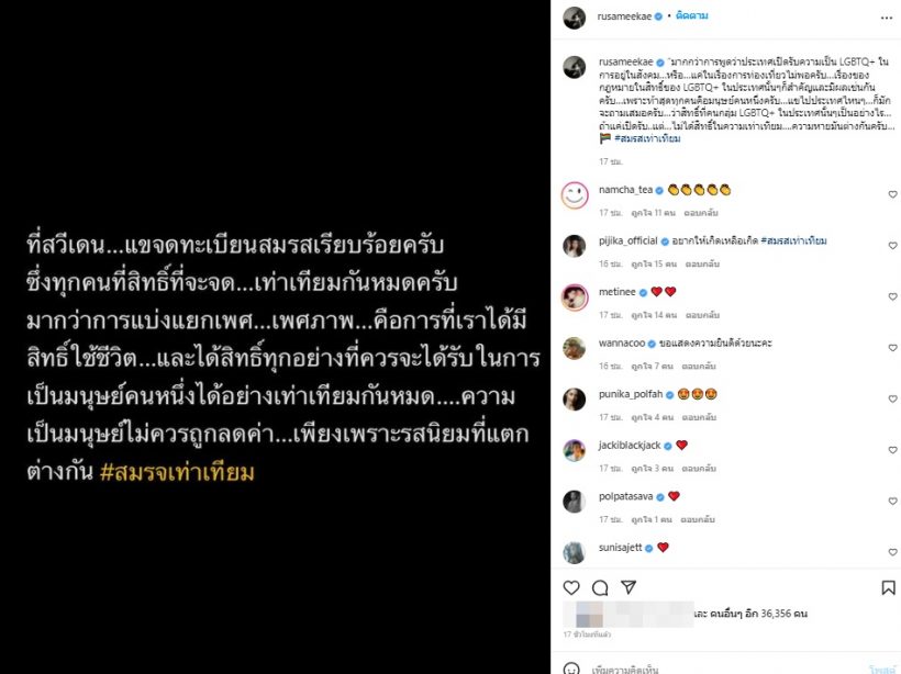 โดยทางด้าน รัศมีแข ได้โพสต์ผ่านอินสตราแกรม @rusameekae ว่า “ที่สวีเดน แขจดทะเบียนสมรสเรียบร้อยครับ ซึ่งทุกคนที่สิทธิ์ที่จะจด เท่าเทียมกันหมดครับ มากกว่าการแบ่งแยกเพศ เพศสภาพ คือการที่เราได้มีสิทธิ์ใช้ชีวิต และได้สิทธิ์ทุกอย่างที่ควรจะได้รับในการเป็นมนุษย์ได้อย่างเท่าเทียมกันหมด ความเป็นมนุษย์ไม่ควรถูกลดค่า เพียงเพราะรสนิยมที่แตกต่างกัน #สมรสเท่าเทียม”