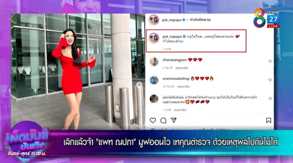 เคยมาเปิดใจคบกับนายตำรวจ นาย ณภัทร เป็นครั้งแรก ในรายการ “เผ็ดมันส์บันเทิง” ช่อง 8 เมื่อปลายปีที่แล้ว วันนี้ดาราพิธีกรสาวสวย “แพท ณปภา” ฉายา “แพท 8G ก็ขอประกาศ “เลิกกัน” เป็นครั้งแรกในรายการอีกครั้ง แถมเป็นวันวาเลนไทน์พอดี ผ่านทาง แอน และ จ๊ะจ๋า เผ็ดมันส์บันเทิง ว่าสถานะตอนนี้ เลิกกันแน่นอนแล้ว พร้อมมูฟออนไว และมีคนคุยคนใหม่แล้ว ด้วยเหตุผลไปด้วยกันไม่ได้ !!!