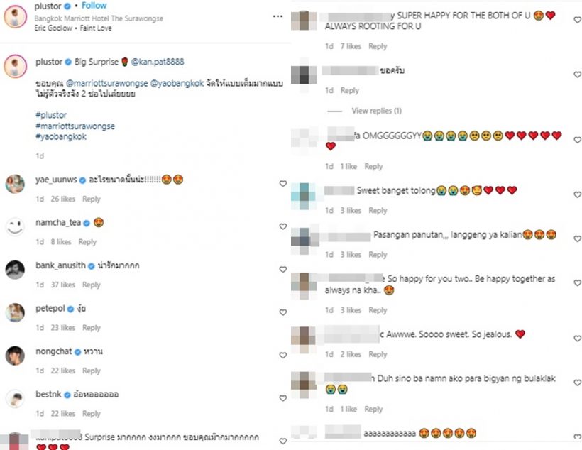 ล่าสุด เนื่องในวันวาเลนไทน์ พลัสเตอร์ได้หอบช่อดอกไม้ช่อใหญ่มาเซอร์ไพรส์หวานใจหนุ่ม “กัณจ์ พัฒนเสรี” ดีกรีเป็นถึงผู้บริหารบริษัท เก็ทฟิน จำกัด ขณะพากันดินเนอร์บนดาดฟ้า พร้อมกับโพสต์คลิปน่ารัก ๆ ผ่านอินสตราแกรม @plustor พร้อมแคปชั่นบอกว่า “Big Surprise @kan.pat8888 ขอบคุณ @marriottsurawongse @yaobangkok จัดให้แบบเต็มมากแบบไม่รู้ตัวจริงจัง 2 ช่อไปเล้ยยยย #plustor #marriottsurawongse #yaobangkok”