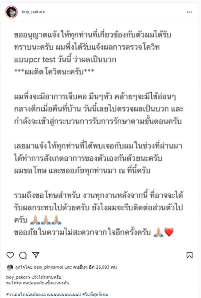 บอย ปกรณ์ ฉัตรบริรักษ์ ได้โพสต์อินสตาแกรมแจ้งข่าว ตรวจพบเชื้อโควิด-19 พร้อมแคปชั่นว่า