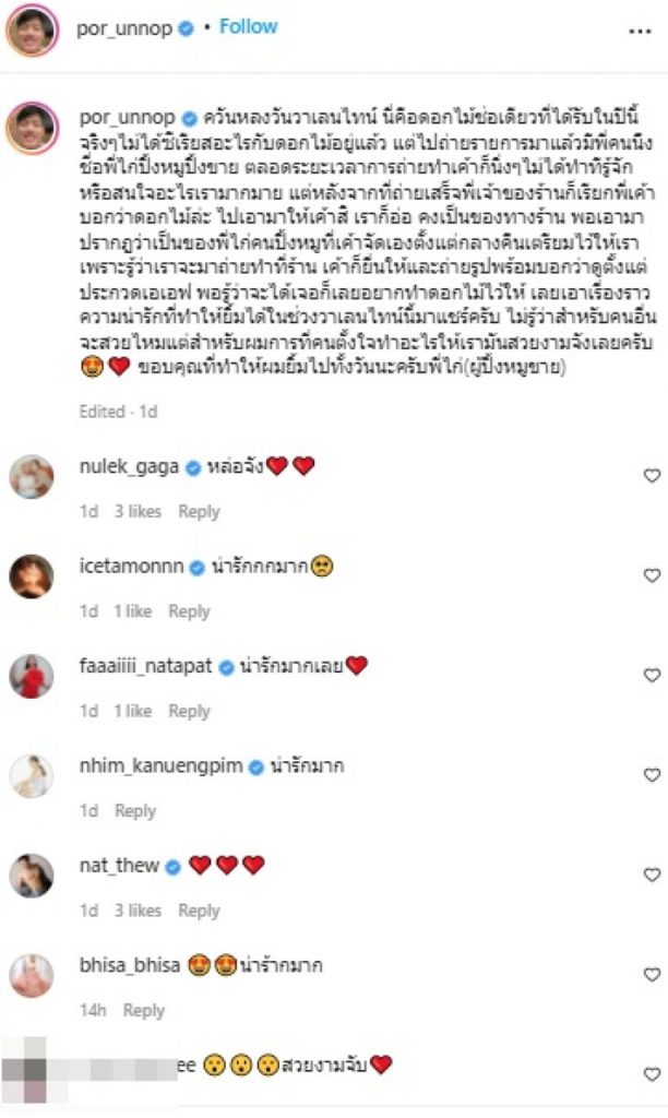 ล่าสุด “หนุ่มปอ” ได้โพสต์ภาพคู่กับช่อดอกไม้สวย ๆ พร้อมข้อความบอกว่า “ควันหลงวันวาเลนไทน์ นี่คือดอกไม้ช่อเดียวที่ได้รับในปีนี้ จริงๆไม่ได้ซีเรียสอะไรกับดอกไม้อยู่แล้ว แต่ไปถ่ายรายการมาแล้วมีพี่คนนึงชื่อพี่ไก่ปิ้งหมูปิ้งขาย ตลอดระยะเวลาการถ่ายทำเค้าก็นิ่งๆไม่ได้ทำทีรู้จักหรือสนใจอะไรเรามากมาย แต่หลังจากที่ถ่ายเสร็จพี่เจ้าของร้านก็เรียกพี่เค้าบอกว่าดอกไม้ล่ะ ไปเอามาให้เค้าสิ เราก็อ่อ คงเป็นของทางร้าน พอเอามาปรากฎว่าเป็นของพี่ไก่คนปิ้งหมูที่เค้าจัดเองตั้งแต่กลางคืนเตรียมไว้ให้เราเพราะรู้ว่าเราจะมาถ่ายทำที่ร้าน เค้าก็ยื่นให้และถ่ายรูปพร้อมบอกว่าดูตั้งแต่ประกวดเอเอฟ พอรู้ว่าจะได้เจอก็เลยอยากทำดอกไม้ไว้ให้ เลยเอาเรื่องราวความน่ารักที่ทำให้ยิ้มได้ในช่วงวาเลนไทน์นี้มาแชร์ครับ ไม่รู้ว่าสำหรับคนอื่นจะสวยไหมแต่สำหรับผมการที่คนตั้งใจทำอะไรให้เรามันสวยงามจังเลยครับ ขอบคุณที่ทำให้ผมยิ้มไปทั้งวันนะครับพี่ไก่(ผู้ปิ้งหมูขาย)”