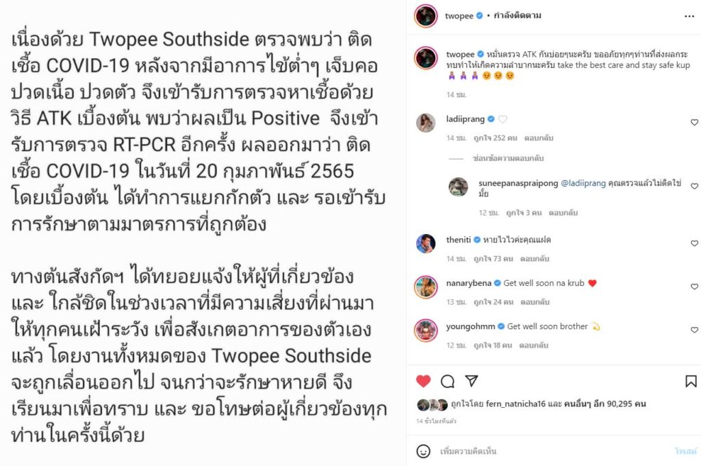 โต้ง ทูพี แร็ปเปอร์คนดัง หวานใจ สาว ปราง กัญญ์ณรัณ ออกมปาระกาศติดโควิดแล้ว โดยหนุ่มโต้งเล่าว่ามีอาการไข้ต่ำ ๆ ปวดเนื้อตัวและเจ็บคอ จึงไปตรวจ ATK ด้วยตัวเอง ปรากฎว่าเป็นบวก และก็ไปตรวจ PCR อีกรอบ ผลออกมาพบว่าติดเชื้อ จึงรีบแจ้งทุกฝ่ายที่เกี่ยวข้องและขอโทษที่ต้องเลื่อนงานต่าง ๆ ออกไป