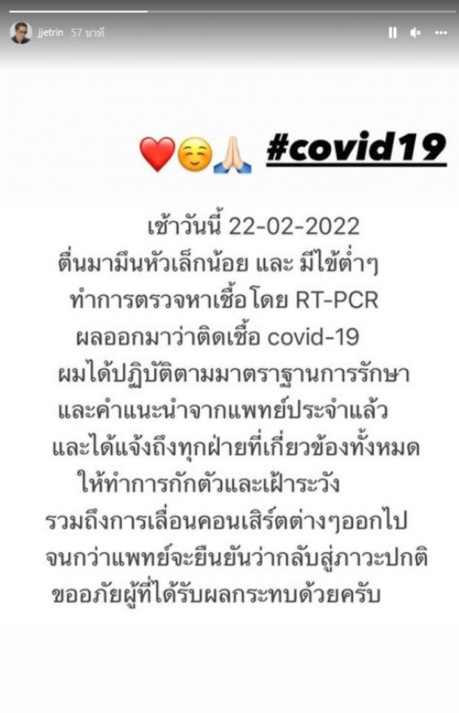 เจ เจตริน วรรธนะสิน ออกมาแจ้งข่าวว่าตัวเองติดเชื้อโควิด-19 โดยเแจ้งผ่านอินสตาแกรม ว่า