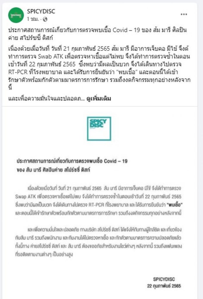 ค่ายเพลงดัง SPICYDISC ได้แจ้งข่าว ส้มมารี ติดโควิด-19