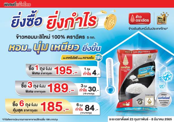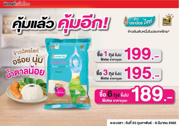 “คุ้มแล้ว คุ้มอีก” ซื้อข้าวฉัตรไลท์ ขนาด 5 กก. จำนวน 1 ถุงขึ้นไป ราคาพิเศษถุงละ 199 บาท ซื้อครบ 3 ถุงขึ้นไป ราคาพิเศษถุงละ 195 บาท และซื้อครบ 6 ถุงขึ้นไป ราคาพิเศษถุงละ 189 บาท ราคาคุ้มๆ แบบนี้ หาซื้อได้ที่แม็คโครทุกสาขา หรือ คลิกลิงค์สั่งซื้อ https://www.makroclick.com/th/products/842054-Chat-Lite-Rice-RD43-5-kg/ เริ่มแล้วตั้งแต่วันที่ 23 กุมภาพันธ์-8 มีนาคม 2565 ที่ Makro ทุกสาขาที่ร่วมรายการ