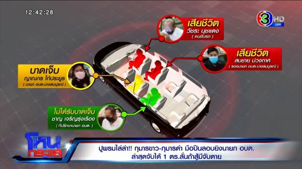 ดร.ญาณกร : ฝั่งซ้ายมือสุด ฝังขวาเป็นรองสมชาย ข้างหน้าวัชระ คนขับ ข้างหลังฝั่งเดียวกันคือชาญ เจริญรุ่งเรือง