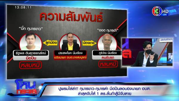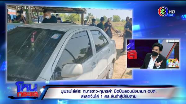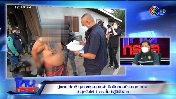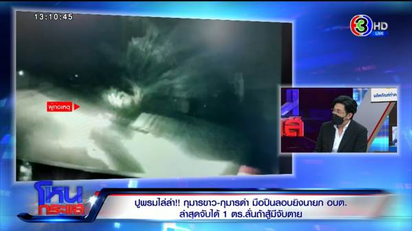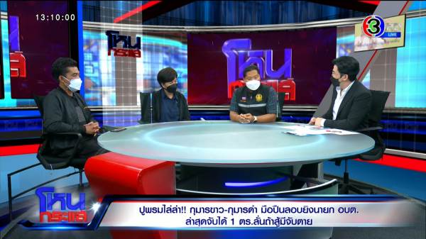 รายการโหนกระแสวันที่ 23 ก.พ. 65 ดำเนินรายการโดย “หนุ่ม กรรชัย กำเนิดพลอย” ผลิตในนามบริษัท ดีคืนดีวัน จำกัด ออกอากาศทุกวันจันทร์-ศุกร์ เวลา 12.35 น. ทางช่อง 3 กดเลข 33 เกาะติดการไล่ล่าคนร้ายใช้อาวุธสงครามกราดยิง นายกอบต. บางสมบูรณ์ ขณะนั่งรถตู้กลับจากประชุมนายก อบต. จังหวัดนครนายก ซึ่งทำให้มีคนเสียชีวิต 2 ราย โดยสัมภาษณ์ ผศ.ดร.ญาณกร โท้ประยูร นายก อบต. บางสมบูรณ์ ที่ถูกลอบยิง , นวล สุภัค ม่วงกาศ – ชาญศิลป์ ม่วงกาศ ภรรยาและลูกชายรองนายก อบต. “สมชาย ม่วงกาศ” ที่เสียชีวิต