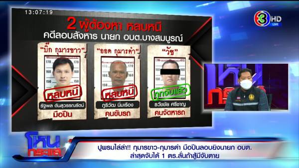 ล่าสุดตร.ออกหมายจับทั้งหมด 3 คน มี นายบิ๊ก รัชพล ฉายากุมารขาว อายุ 35 ปี ต่อมานายภูริวัฒ นิ่มเรือง หรือนายออด ฉายากุมารดำ , นายธวัชชัย ศรีชาญ หรือ วัช คนจัดหารถ บิ๊กคือคนยิง พี่นวลคือภรรยาท่านรองสมชาย จริงๆ เขาลือกันว่าธวัชชัยเป็นญาตินายกรองสมชายจริงมั้ย?