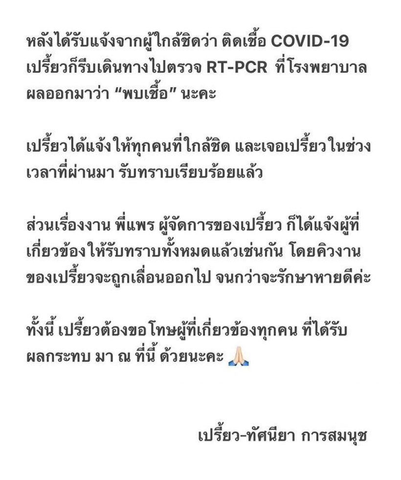 “หลังได้รับแจ้งจากผู้ใกล้ชิดว่า ติดเชื้อ COVID-19 เปรี้ยวก็รีบเดินทางไปตรวจ RT-PCR ที่โรงพยาบาล ผลออกมาว่า “พบเชื้อ” นะคะ เปรี้ยวได้แจ้งให้ทุกคนที่ใกล้ชิด และเจอเปรี้ยว ในช่วง เวลาที่ผ่านมา รับทราบเรียบร้อยแล้ว ส่วนเรื่องงาน พี่แพร ผู้จัดการของเปรี้ยว ก็ได้แจ้งผู้ที่เกี่ยวข้องให้รับทราบทั้งหมดแล้วเช่นกัน โดยคิวงานของเปรี้ยวจะถูกเลื่อนออกไป จนกว่าจะรักษาหายดีค่ะ