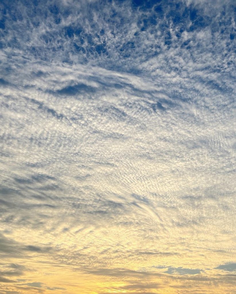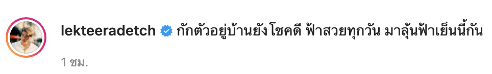 และล่าสุดกับภาพของหนุ่มอาเล็กที่โพสต์ภาพผ่านทางไอจีส่วนตัว เป็นบรรยากาศของท้องฟ้าที่สุดสดใส มีเมฆเป็นริ้วเรียงกันสวยงาม พร้อมด้วยข้อความว่า “กักตัวอยู่บ้านยังโชคดี ฟ้าสวยทุกวัน มาลุ้นฟ้าเย็นนี้กัน”