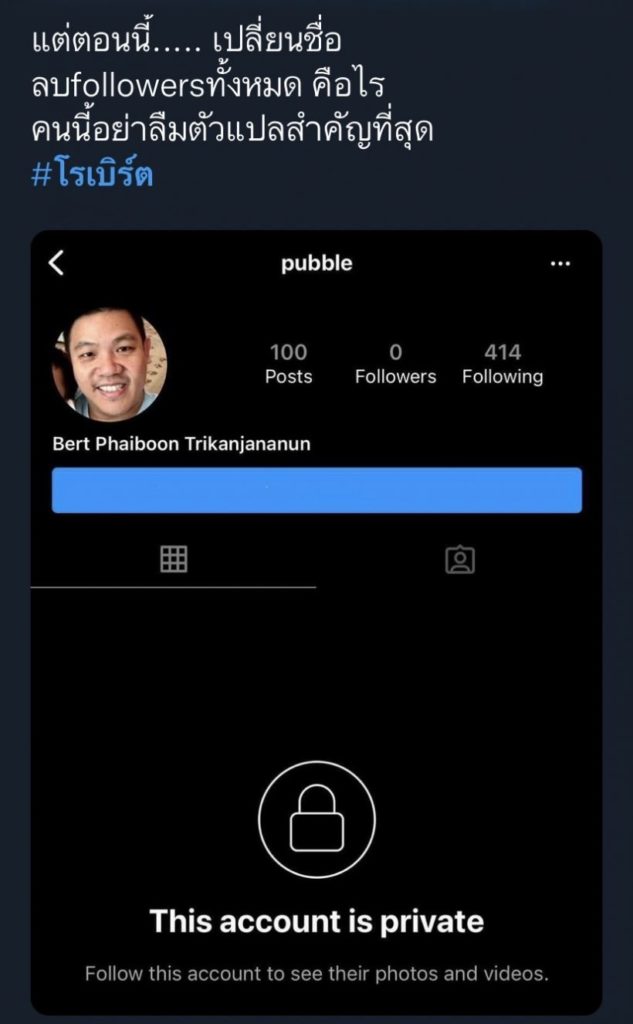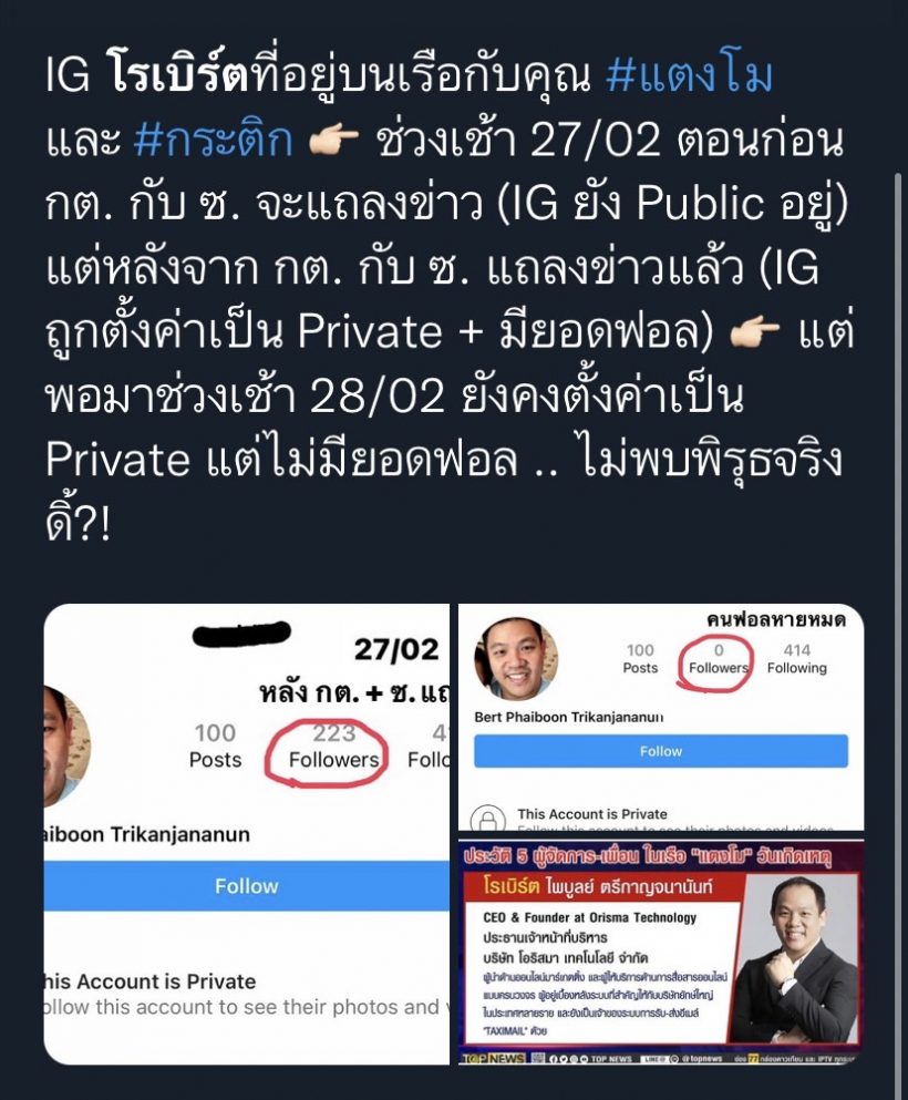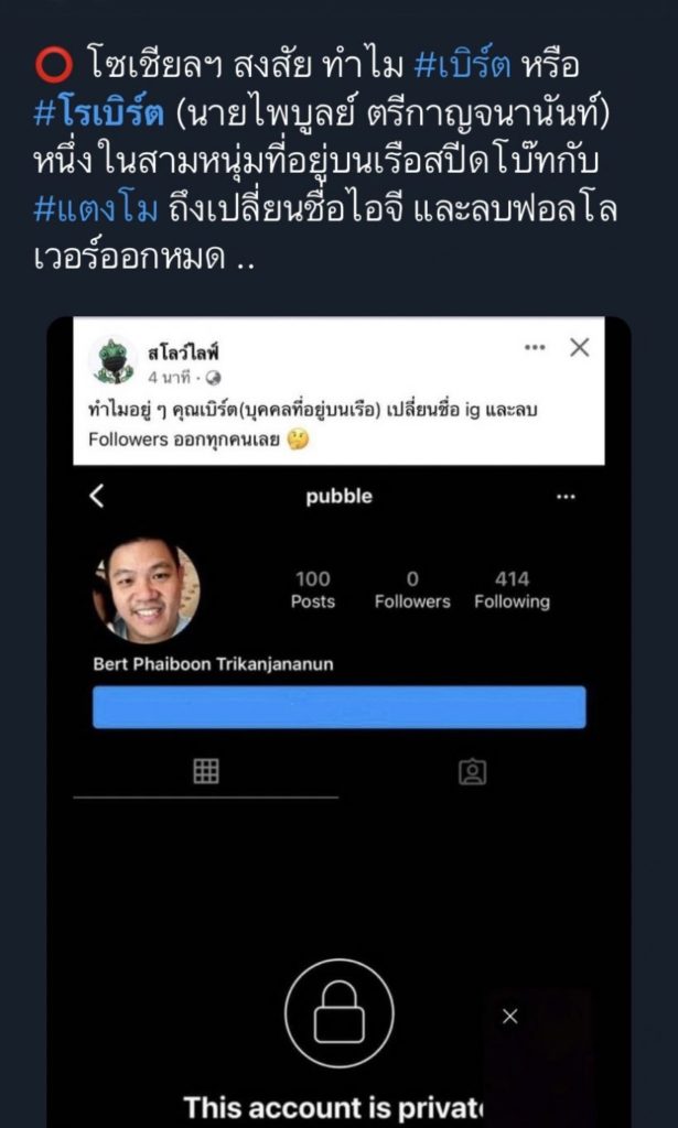 ล่าสุด ชาวโซเชียลได้จับโป๊ะ  โรเบิร์ต ที่เป็นหนึ่งในคนที่อยู่บนเรือสปีดโบ๊ท ล่าสุดเจ้าตัวเคลื่อนไหวผ่านอินสตราแกรมส่วนตัวของเขา พบว่าตอนนี้เจ้าตัวมีการเปลี่ยนชื่ออินสตาแกรมใหม่เป็น pubble พร้อมกับตั้งค่าให้เป็นไพรเวทแถมโรเบิร์ตลบผู้ติดตามทั้งหมดออกเหลือ 0 คน งานนี้หลายคนจึงตั้งคำถามว่าเกิดอะไรขึ้น!!!