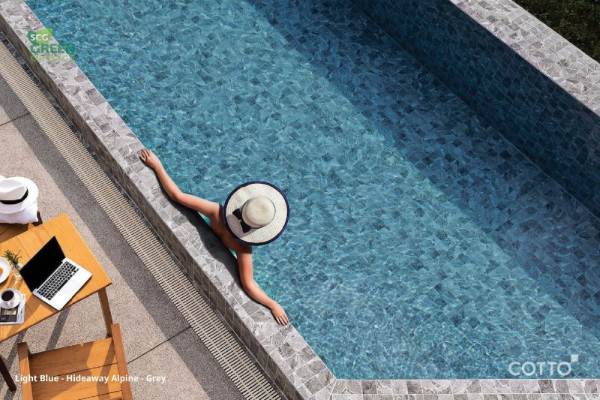 - แบบ Light Blue ที่พร้อมเพิ่มลูกเล่นให้น่าสนใจ พร้อมขยับโทนสีฟ้าอ่อนของน้ำ ให้โดดเด่นเพิ่มมากขึ้น จากกระเบื้องสระว่ายน้ำ X-Porcelain กลุ่มโทนสีเทา นำลาย Hideaway Alpine – Grey ที่ได้แรงบันดาลใจจากลวดลายหินของเทือกเขาสูงในสวิสเซอแลนด์ นำมาถ่ายทอดลงบนชิ้นกระเบื้องอย่างสวยงาม.