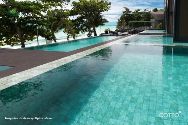 - แบบ Turquoise ดีไซน์นี้เพิ่มเสน่ห์ของผืนน้ำในสระ ให้ดูชื่นฉ่ำด้วยกระเบื้องสระว่ายน้ำ X-Porcelain ลาย Hideaway Alpine – Green กลุ่มโทนสีฟ้าอมเขียว ที่ช่วยขับให้โทนสีน้ำสดใส เสมือนว่ายน้ำอยู่ในทะเลแถบแคริเบียนกลาย ๆ