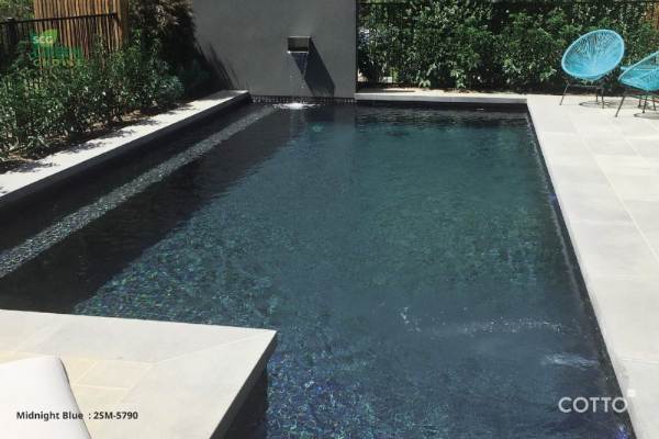 - แบบ Midnight Blue ดีไซน์นี้ดึงความสวยและลึกลับของทะเลน้ำลึกด้วยการเลือกใช้กระเบื้องสระว่ายน้ำโทนสีเทาเข้ม เทาดำหรือสีดำ ลาย 2SM-5790 ในโทนสีดำ เหมาะกับสระว่ายน้ำสไตล์รีสอร์ที่มีต้นไม้รายล้อมอยู่รอบสระ