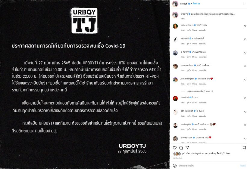 “UrboyTJ” แจ้งว่าติดเชื้อโควิด19