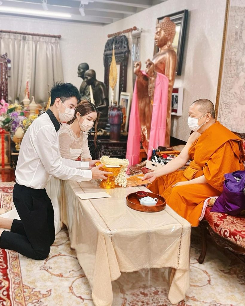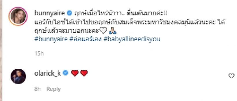 เเอร์ ภัณฑิลา ฟูกลิ่น โพสต์ภาพพร้อมข้อความว่า ฤกษ์เมื่อไหร่น้าาา.. ตื่นเต้นมากค่ะ!! แอร์กับไอซ์ได้เข้าไปขอฤกษ์กับสมเด็จพระมหารัชมงคลมุนีแล้วนะคะ ได้ฤกษ์แล้วจะมาบอกนะคะ #bunnyaire #อ่อแอร์เอง #babyallineedisyou