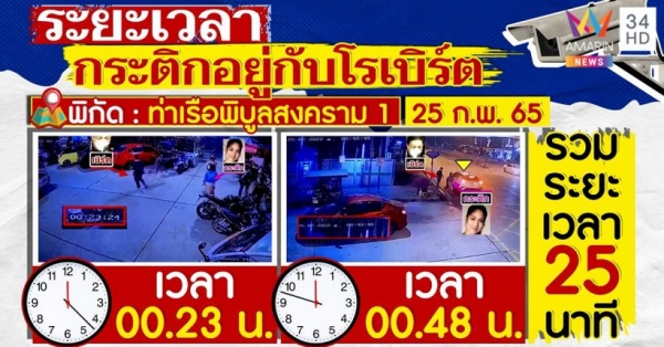 วันที่ 5 มีนาคม 2565 ทีมข่าวอัมรินทร์ทีวี ได้กล้องวงจรปิด ภาพช่วงที่กระติกและโรเบิร์ต เดินจากท่าเรือมาขอเข้าห้องน้ำ เมื่อช่วงวันที่ 25 กุมภาพันธ์ 2565 หลังเกิดเหตุ เวลา 00.23 นาที และมีกล้องมุมถัดมา ระหว่างเดิน เวลา 00.23 น. เป็นกล้องหน้าบ้านที่ขอเข้าห้องน้ำ โรเบิร์ตรอหน้าห้องน้ำ มีผู้หญิงขอเข้าห้องน้ำด้วย เวลา 00.23 น. และเดินออกจากห้องน้ำ 00.28 น.