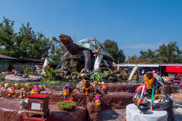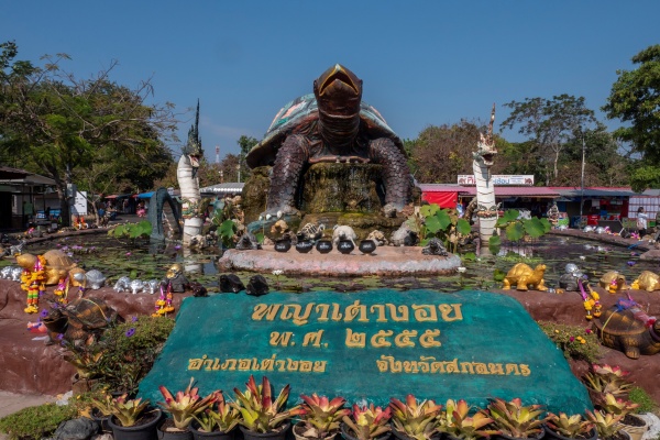 พญาเต่างอย จ.สกลนคร : จำลองพญาเต่างอย ขนาดใหญ่ พร้ององค์บูชาจริง โดยเชื่อว่าผู้ที่ได้มาสักการะบูชาจะทำให้อายุยืนยาวมีโชคมีลาภกลับบ้านไปทุกคน