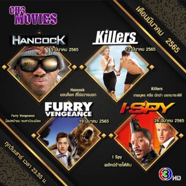 ส่งท้ายคนนอนดึกด้วย แชนแนล ทรี มูฟวี่ส์ ภาพยนตร์ดี ๆ เวลา 23.55-02.15 น. ทุกวันเสาร์ เริ่มจาก เสาร์ที่ 5 มีนาคม 2565 ภาพยนตร์ฝรั่งเรื่อง Hancock : แฮนค็อค ฮีโร่ขวางนรก นำแสดงโดย : วิล สมิธ, ชาร์ลิซ เธอร์รอน, เจสัน เบทแมน วันเสาร์ที่ 12 มีนาคม 2565 ภาพยนตร์ฝรั่งเรื่อง Killers : เทพบุตร หรือ นักฆ่า บอกมาซะดีดี นำแสดงโดย : แอชตัน คุทเชอร์, แคทเธอรีน ไฮเกล, ทอม เซลเล็ค, แคทเธอรีน โอฮาร่า วันเสาร์ที่ 19 มีนาคม 2565 ภาพยนตร์ฝรั่งเรื่อง Furry Vengeance : ม็อปหน้าขน ซนซ่าป่วนเมือง นำแสดงโดย : แบรนแดน เฟรเซอร์, บรู๊ค ชีลส์, แมตต์ โปรค็อป และ วันเสาร์ที่ 26 มีนาคม 2565 ภาพยนตร์ฝรั่งเรื่อง I Spy : พยัคฆ์ร้ายใต้ดิน นำแสดงโดย : โอเว่น วิลสัน, เอ็ดดี้ เมอร์ฟีย์, มัลคอล์ม แม็คดูเวลล์, เจย์ บารูเซล