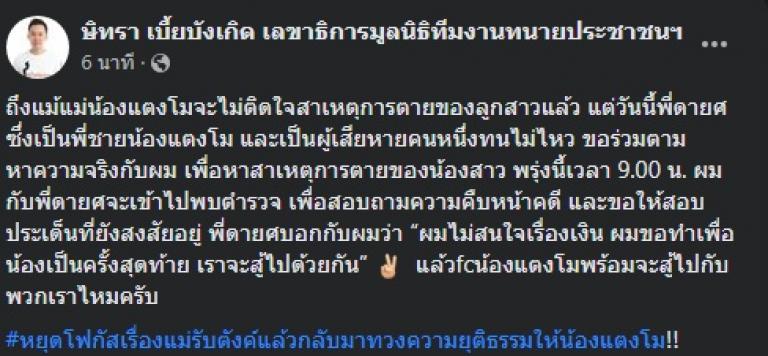“ถึงแม้แม่น้องแตงโมจะไม่ติดใจสาเหตุการตายของลูกสาวแล้ว แต่วันนี้พี่ดายศซึ่งเป็นพี่ชายน้องแตงโม และเป็นผู้เสียหายคนหนึ่งทนไม่ไหว ขอร่วมตามหาความจริงกับผม เพื่อหาสาเหตุการตายของน้องสาว พรุ่งนี้เวลา 9.00 น. ผมกับพี่ดายศจะเข้าไปพบตำรวจ เพื่อสอบถามความคืบหน้าคดี และขอให้สอบประเด็นที่ยังสงสัยอยู่ พี่ดายศบอกกับผมว่า “ผมไม่สนใจเรื่องเงิน ผมขอทำเพื่อน้องเป็นครั้งสุดท้าย เราจะสู้ไปด้วยกัน” ✌🏻 แล้วfcน้องแตงโมพร้อมจะสู้ไปกับพวกเราไหมครับ”