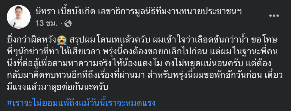 “ยิ่งกว่าผิดหวัง😭 สรุปผมโดนเทแล้วครับ ผมเข้าใจว่าเลือดข้นกว่าน้ำ ขอโทษพี่ๆนักข่าวที่ทำให้เสียเวลา พรุ่งนี้คงต้องขอยกเลิกไปก่อน แต่ผมในฐานะพี่คนนึงที่ต่อสู้เพื่อตามหาความจริงให้น้องแตงโม คงไม่หยุดแน่นอนครับ แต่ต้องกลับมาคิดทบทวนอีกทีถึงเรื่องที่ผ่านมา สำหรับพรุ่งนี้ผมขอพักซักวันก่อน เดี๋ยวมีแรงแล้วมาลุยต่อกันนะครับ