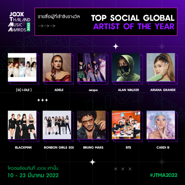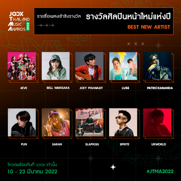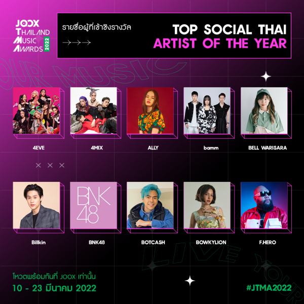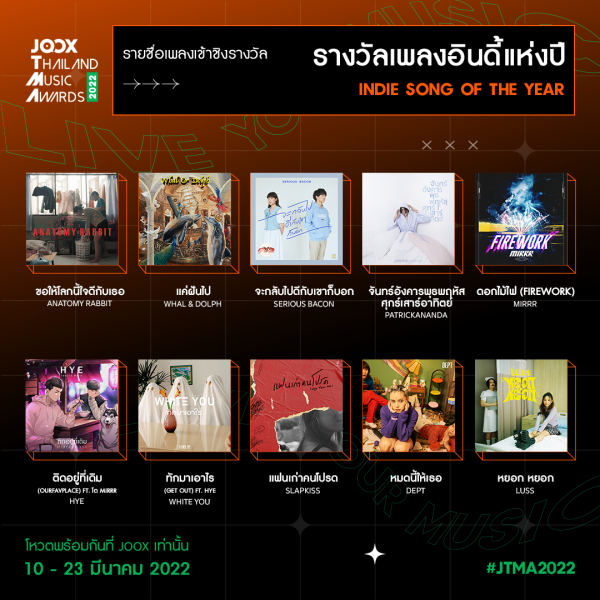 (กรุงเทพฯ – 7 มีนาคม 2565) –  เปิดโหวต! JOOX เดินหน้าจัดงานประกาศรางวัลทางดนตรีแห่งปี ‘JOOX Thailand Music Awards 2022 หรือ ‘JTMA 2022’ ปีที่ 6 ภายใต้คอนเซปต์ ‘Live Your Music’ ผ่านแนวคิด ‘เพราะดนตรีคือชีวิต ไม่ว่าจะอยู่โมเมนต์ไหนของชีวิต เราทุกคนมีเสียงดนตรีที่คอยเป็นพลังให้อยู่เสมอ พร้อมเปิดรายชื่อศิลปินที่เข้าชิงสุดยอดรางวัลทางดนตรีแห่งปี JTMA 2022 ทั้ง 12 สาขา โดยเปิดให้คนในแวดวงดนตรี และแฟนเพลงทั่วประเทศร่วมโหวต  และส่งพลังเชียร์ให้ศิลปินที่รักไปพร้อมกันทั่วประเทศ ตั้งแต่วันที่ 10 – 23 มีนาคม รักใคร ชอบเพลงไหน มาโหวตกันเลยที่แอปพลิเคชัน และเว็บไซต์ JOOX แล้วอย่าลืมปักหมุดมาลุ้นและสนุกไปกับไลฟ์ประกาศงานรางวัลกันได้ในวันอังคารที่ 5 เมษายน ทาง JOOX มิวสิคแอปพลิเคชัน ที่เดียวเท่านั้น