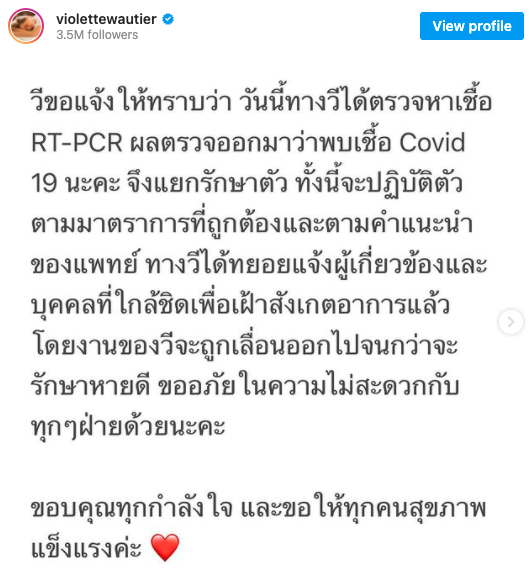 ล่าสุด “วี” วิโอเลต วอเทียร์ โพสต์แจ้งติดโควิดผ่านอินสตราแกรมส่วนตัว @ violettewautier ระบุว่า…