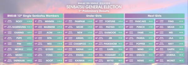 ลำดับที่ 34 พั้นซ์ – วัชรี ด่านผาสุกกุล วง CGM48 ลำดับที่ 35 เฟม-นันทภัค กิตติรัตนวิวัฒน์ วงBNK48 ลำดับที่ 36 แพนด้า – จิดาภา แช่มช้อยวงBNK48 ลำดับที่ 37 ป๊อปเป้อ – พิณญาดา จึงกาญจนา วง BNK48 ลำดับที่ 38 มายด์- ปณิศา ศรีละเลิง วงBNK48 ลำดับที่ 39 เกรซ- วิรัลพัชร ธำรงค์พันธวนิชวงBNK48 ลำดับที่ 40 นีนี่- พิชญาภา สุปัญญา วงCGM48 ลำดับที่ 41 ปิ๊ง- พิณพณา แสงบุญ วงCGM48 ลำดับที่ 42 มีน -ณัฐธันยา ดุลยพล วง BNK48 ลำดับที่ 43 เหมย – รพีพรรณ แช่มเจริญ วงCGM48 ลำดับที่ 44 จ๋า-ณปภัช วรพฤทธานนท์ วงBNK48 ลำดับที่ 45 นิกี้ – วรินท์รัตน์ ยลประสงค์ วงBNK48 ลำดับที่46 เอิร์ธ – นภสรณ์ ศิริปาณี วงBNK48 ลำดับที่ 47 รินะ อิซึตะวงCGM48 และลำดับที่ 48 โมเน่ต์ – ภาริตา ริเริ่มกุล วงBNK48 เป็นต้น