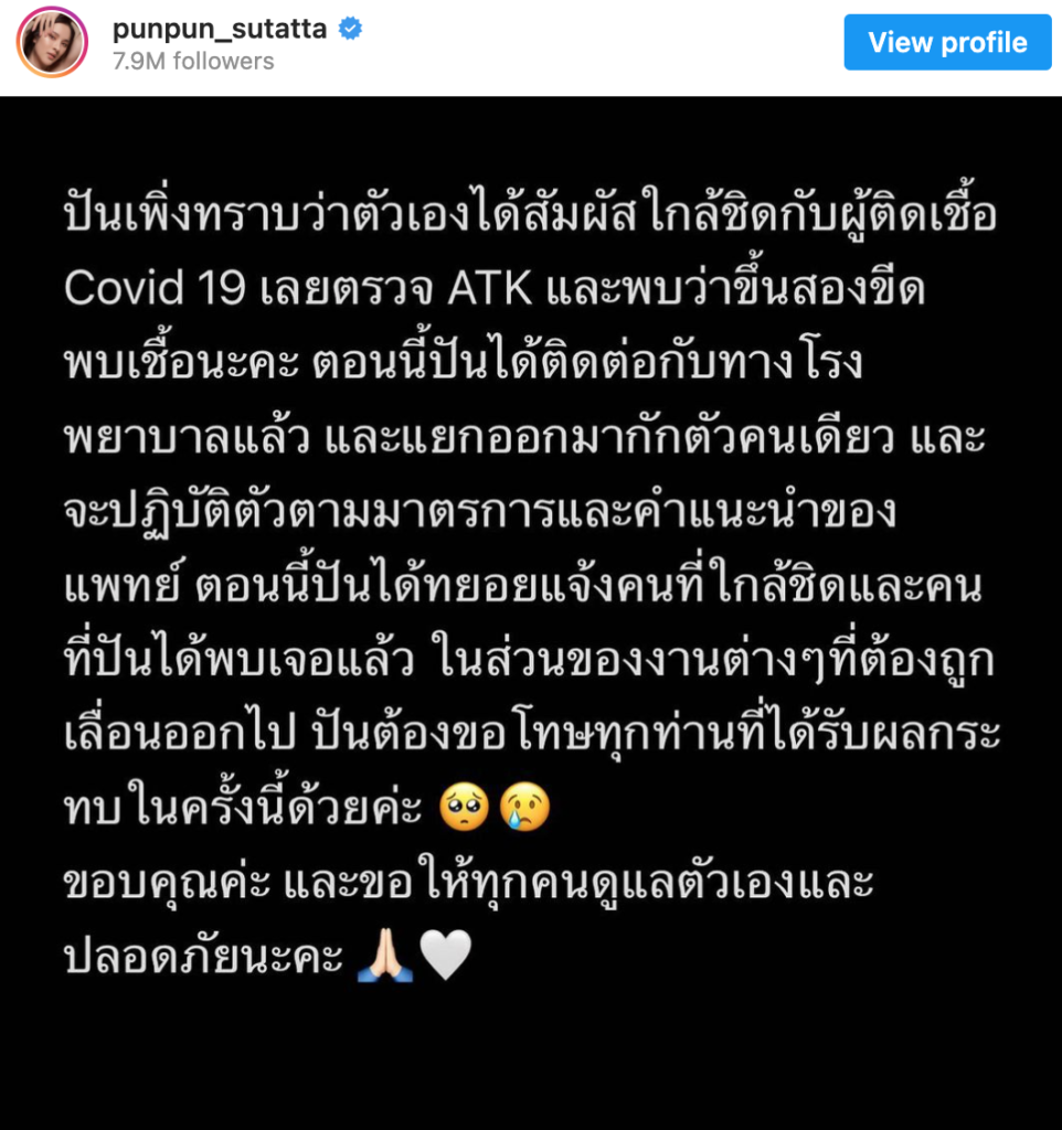 โดย “ปันปัน” โพสต์ข้อความ โดยระบุว่า…ปันเพิ่งทราบว่าตัวเองได้สัมผัสใกล้ชิดกับผู้ติดเชื้อ Covid 19 เลยตรวจ ATK และพบว่าขึ้นสองขีด พบเชื้อนะคะ ตอนนี้ปันได้ติดต่อกับทางโรงพยาบาลแล้ว และแยกออกมากักตัวคนเดียว และจะปฏิบัติตัวตามมาตรการและคำแนะนำของแพทย์