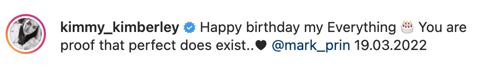 ล่าสุดสาวสวย “คิมเบอร์ลี่” โพสต์หวานลงไอจีเป็นภาพฉลองวันเกินของหนุ่ม “หมาก ปริญ” พร้อมกันแคปชั่นหวาน ๆ โดยระบุว่า “Happy birthday my Everything 🎂 You are proof that perfect does exist..♥️ @mark_prin 19.03.2022″