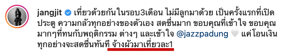 โดยสาวแจงโพสต์แคปชั่เอาไว้ว่า “เที่ยวด้วยกันในรอบ3เดือน ไม่มีลูกมาด้วย เป็นครั้งแรกที่เปิดประตู ความกลัวทุกอย่างของตัวเอง สดชื่นมาก ขอบคุณที่เข้าใจ ขอบคุณมากๆที่ทนกับพฤติกรรม ต่างๆ และเข้าใจ @jazzpadung 🤍 แค่โอนเงิน ทุกอย่างจะสดชื่นทันที จ้างผัวมาเที่ยวละ1″ สุดท้ายหักมุมมากเมื่อสาวอ่านถึงช่วงท้าย