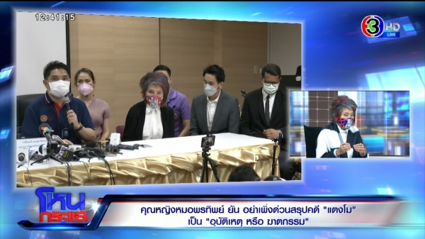 “ใช่ค่ะ ยืนยันอีกทีว่าเพื่อจะบอกว่าทีมแพทย์นิติเวชทีมแรก เขาได้ทำการตรวจที่เราเองก็ชื่นชม แค่นั้น”