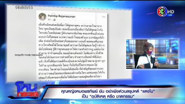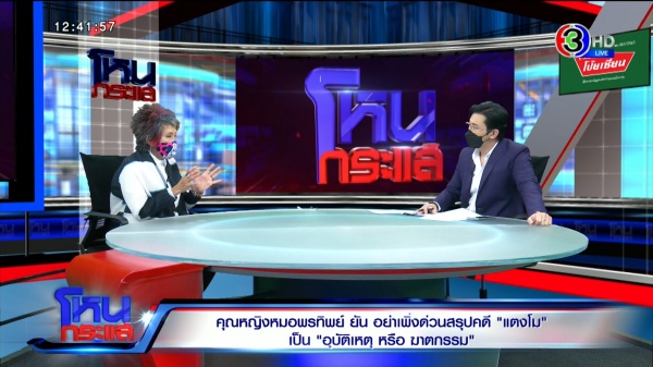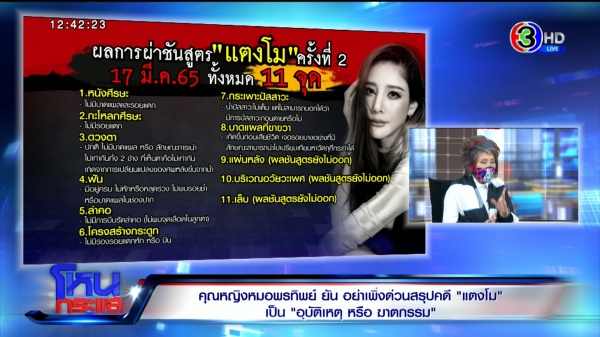 รายการโหนกระแสวันที่ 21 มี.ค. 65 ดำเนินรายการโดย “หนุ่ม กรรชัย กำเนิดพลอย” ผลิตในนามบริษัท ดีคืนดีวัน จำกัด ออกอากาศทุกวันจันทร์-ศุกร์ เวลา 12.35 น. ทางช่อง 3 กดเลข 33 ยังเกาะติดเหตุการณ์การผ่าชันสูตรศพ “แตงโม นิดา พัชรวีระพงษ์” รอบ 2 โดยสัมภาษณ์ “พญ.คุณหญิงพรทิพย์ โรจนสุนันท์” สมาชิกวุฒิสภา และ อดีตผอ.สถาบันนิติวิทยาศาสตร์ ซึ่งร่วมสังเกตการณ์การผ่าชันสูตรศพครั้งที่ 2 ของแตงโม ล่าสุดได้โพสต์เฟซบุ๊กยืนยันว่าไม่ได้พูดตามที่รายการทนายคู่ใจ ของ “ทนายรณรงค์ แก้วเพชร” ทางยูทูบที่ได้นำเสนอเรื่อง หยดเลือดพลิกคดีแตงโม เป็นการฆาตกรรม