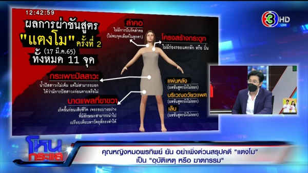 “ครบหมด และไม่มีบาดแผลใดๆ ที่เห็นจากรูปถ่าย สองสามสี่ เป็นแผลตามจุดต่างๆ เขาสงสัยว่ามีการราดน้ำมัน อันนี้คงเป็นการจินตนาการจากโซเชียล เผา เราก็ยืนยัน รวมทั้งการขอให้ตรวจเล็บ ตรวจช่องคลอดก็ตรวจซ้ำอีกที แต่ยังไม่มีผลนะ เพียงแต่ว่าในครั้งนี้ได้บอกให้ฟังว่ามันมีบาดแผลเฉพาะที่ไม่ใช่บาดแผลใหญ่แบบต้นขาขวา รวมทั้งมีรอยช้ำต้นขาซ้าย นี่คือตัวอย่างที่สรุปให้ฟังคร่าวๆ เฉยๆ แต่มีคนไปเข้าใจผิด ที่สำคัญที่สุดคือพยายามจะบอกว่าคุณหมอสถาบันนิติเวช เขาได้ทำอะไรไปเพื่อให้เกิดความไว้วางใจ เช่น เขาเจาะน้ำลูกตา ตรวจหาแอลกอฮอล์นะ เขาได้ทำการตรวจแผ่นอนามัย พบว่าเป็นเลือดประจำเดือน และมีดีเอ็นเอตรงนะ และพยายามดูว่ามันเป็นปัสสาวะมั้ย ปัสสาวะมียูเรีย ก็เลยไปตรวจยูเรีย แต่ก็ยังไม่ได้สรุป เพียงแต่เป็นการบอกว่าเนี่ยเขาทำให้เต็มที่ เพื่อให้เกิดความไว้วางใจในเรื่องการชันสูตรศพ”
