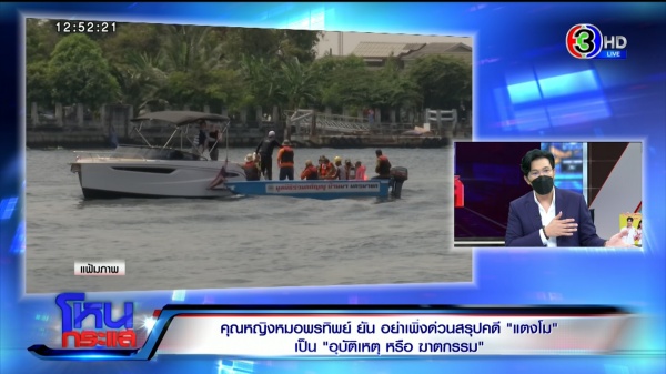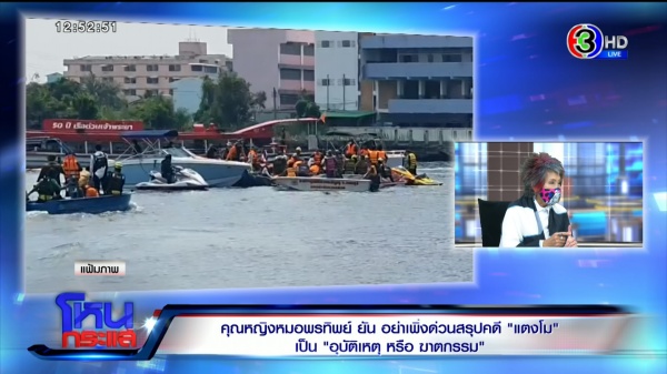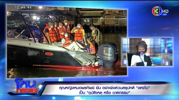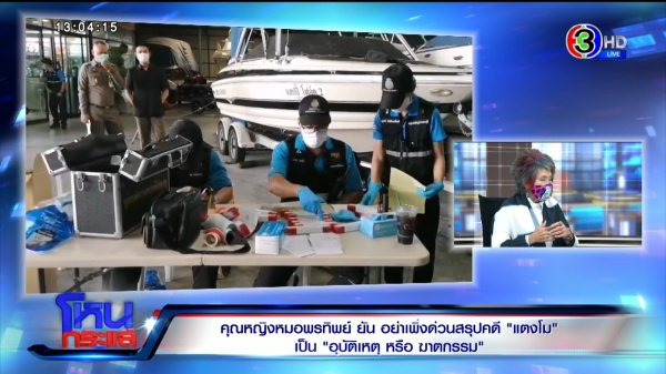 ติดใจอยู่ 2-3 จุด ที่อาจต้องไปพิสูจน์อีกที เมื่อกี้ก่อนเข้ารายการคุณหญิงบอกว่าศพฟ้องมาหมดแล้ว รู้ว่าศพฟ้องอะไรมาบ้าง แต่ที่แน่ ๆ อันต่อไปคือหลักฐานบนเรือ เรือ แวดล้อมต่าง ๆ รวมถึง 5 คนอยู่บนเรือ อันนี้คือสิ่งสำคัญมากกว่าศพ?