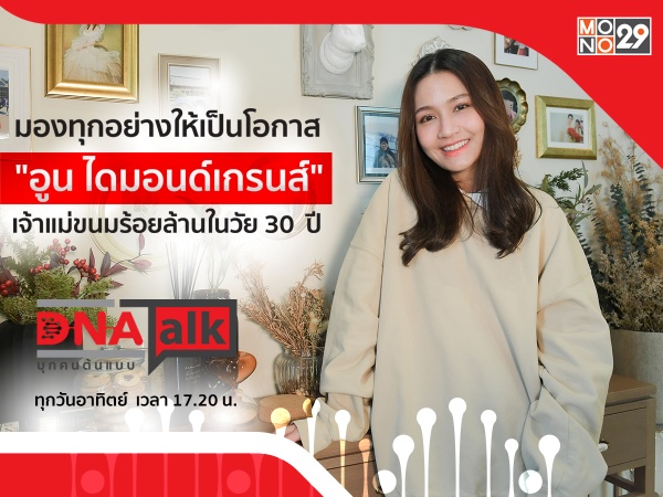 รายการ “DNA TALK บุกคนต้นแบบ” ในวันอาทิตย์นี้ (27 มี.ค.) ต่อเนื่องจากสัปดาห์ที่แล้ว พิธีกร ได๋-ไดอาน่า จงจินตนาการ หลังได้สัมภาษณ์ศิลปินกราฟิกสายเลือดไทยสู่ผลงานที่ดังไกลถึงต่างแดนโดย “คุณพุด-พุทธิมา วงศ์ดีประสิทธิ์” ยังคงเจาะลึก บุกค้นหาดีเอ็นเอความสำเร็จ กับอีกหนึ่งสาวครอบครัวเดียวกัน แต่เส้นทางความสำเร็จยาวไกลไม่แพ้กันอย่าง “คุณอูน-ชนิสรา วงศ์ดีประสิทธิ์” ผู้ก่อตั้งแบรนด์ “ไดมอนด์เกรนส์” เจ้าของผลิตภัณฑ์อาหารเสริม, สินค้าเครื่องหอมสมุนไพร, ร้านอาหาร และอื่นๆ อีกมากมาย ที่กว่าจะมีทุกวันนี้ได้ไม่ใช่เพราะโชคช่วย งานนี้ คุณอูน นักธุรกิจสาวดาวติ๊กต๊อก เจ้าแม่ขนมสองร้อยล้านที่หลายคนรู้จัก ได้แชร์แนวคิดการสู้ในเส้นทางธุรกิจให้ฟังว่า