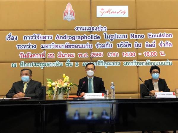 รศ.นพ.ชาญชัย พานทองวิริยะกุล อธิการบดีมหาวิทยาลัยขอนแก่น กล่าวว่า “การแพร่ระบาดของโรคโควิด ทำให้ชื่อของสมุนไพรฟ้าทะลายโจรกลายเป็นความหวังในการบรรเทาอาการของผู้ป่วย เพราะมีสรรพคุณที่ป้องกัน รักษาอาการหวัด และยับยั้งการเพิ่มจำนวนของไวรัส โดยสารสำคัญในฟ้าทะลายโจรที่ให้ฤทธิ์ป้องกันและยับยั้งเชื้อโควิดได้ก็คือ ‘แอนโดรกราโฟไลด์’ (Andrographolide) ซึ่งทุกวันนี้ สารนี้ได้รับความสนใจในระดับสากล มีการนำมาพัฒนามากยิ่งขึ้นด้วยเทคโนโลยีทางการแพทย์ และมีงานวิจัยข้อมูลทางการแพทย์มากมายในต่างประเทศ มหาวิทยาลัยขอนแก่นเอง โดยฝ่ายวิจัยและบัณฑิตศึกษาก็ได้ทำการศึกษาวิจัยเกี่ยวกับสารดังกล่าวมาโดยตลอด จนล่าสุดประสบความสำเร็จในการคิดค้นแนวทางการนำสารแอนโดรกราโฟไลด์มาใช้ให้เกิดประโยชน์กับร่างกายได้อย่างมีประสิทธิภาพ โดยอยู่ในรูปแบบนาโนอิมัลชัน (nano-emulsion)”