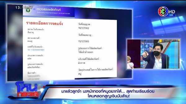 ทนาย : ต้องแบ่งความผิดเป็น 2 ส่วน เท่าที่ฟังจากคุณแม่นะ ในส่วนฉ้อโกง จะสามารถดำเนินคดีได้หรือไม่เป็นการหลอกลวงแล้วได้ทรัพย์สินไปของผู้ถูกหลอกลวงหรือเปล่า เพราะว่าเหมือนเราถูกหลอก เราก็ได้สินค้ามา ถ้าไมได้สินค้าจะเป็นอีกอย่างนึง ทีนี้เป็นความผิดแน่ ๆ คือผลิตภัณฑ์แต่ละอย่างโฆษณาเกินจริงแล้ว สองผลิตภัณฑ์ที่เป็นเครื่องสำอาง การโฆษณาต้องขออนุญาต อะไรบ้างที่ต้องขออนุญาต ยา อาหาร เครื่องสำอาง สมุนไพร แม้แต่สถานพยาบาล คลินิกต่าง ๆ เสริมสวย ก็ต้องไปขออนุญาตโฆษณา จะไปโฆษณาดื้อๆ ไม่ได้เป็นความผิด สองสลากก็ผิด สลากไม่ได้ระบุวันเดือนปีที่ผลิต ไม่ได้ระบุสถานที่ผลิต จำหน่ายโดยใครก็ไม่มี เขาอาศัยแค่เลขจดแจ้ง ก็คือเราต้องขออย. เขาก็เอาเลขที่จดแจ้งที่อย.รับไว้เพื่อพิจารณาเอามาลงในผลิตภัณฑ์ ซึ่งตรงนี้เป็นช่องโหว่นิดนึง จริง ๆ แล้วผลิตภัณฑ์ยังไม่ได้รับอย.เลยด้วยซ้ำ