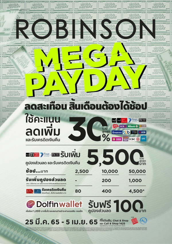 ห้างสรรพสินค้าโรบินสัน ในเครือเซ็นทรัล รีเทล จัดแคมเปญสุดคุ้มช่วงสิ้นเดือน “Robinson Mega Payday” (โรบินสัน เมกา เพย์ เดย์) #ลดสะเทือนสิ้นเดือนต้องได้ช้อป ที่มาพร้อมดีลโปรโมชั่นสุดพิเศษเอาใจสาย ช้อปมากมาย ไม่ว่าจะเป็น…